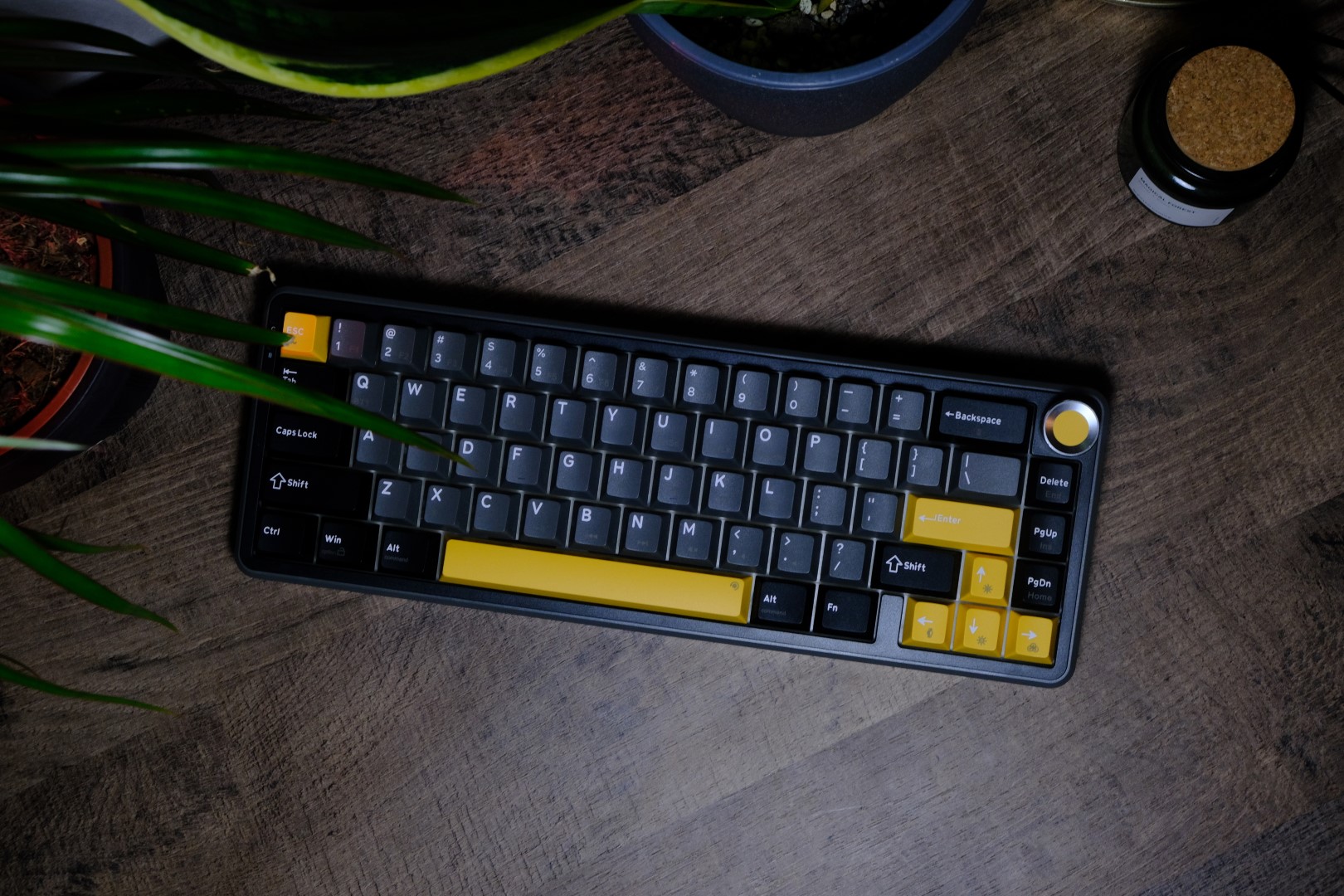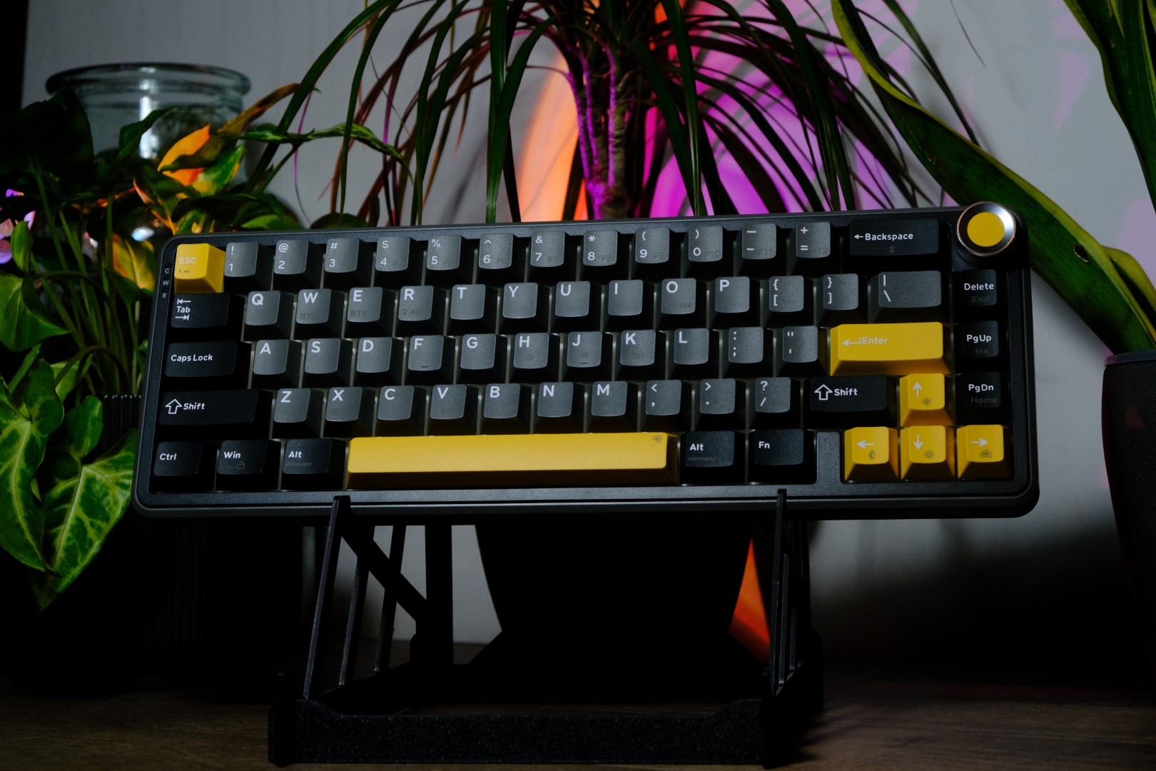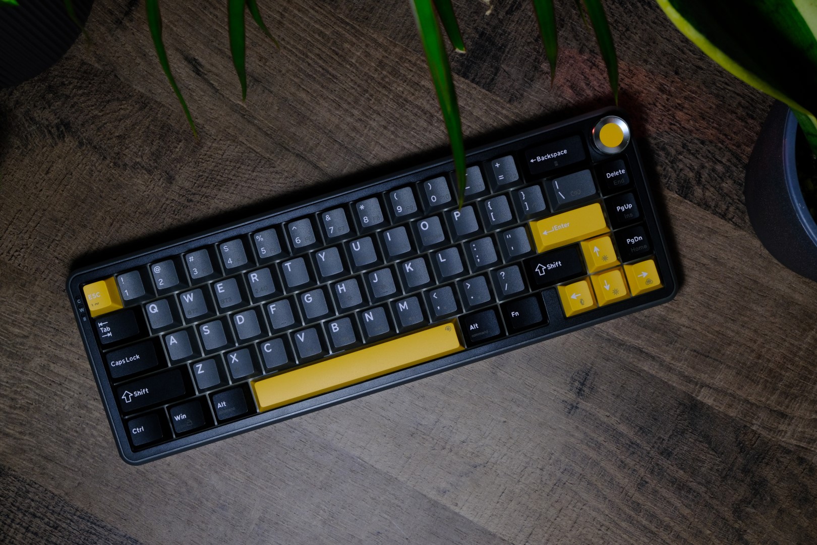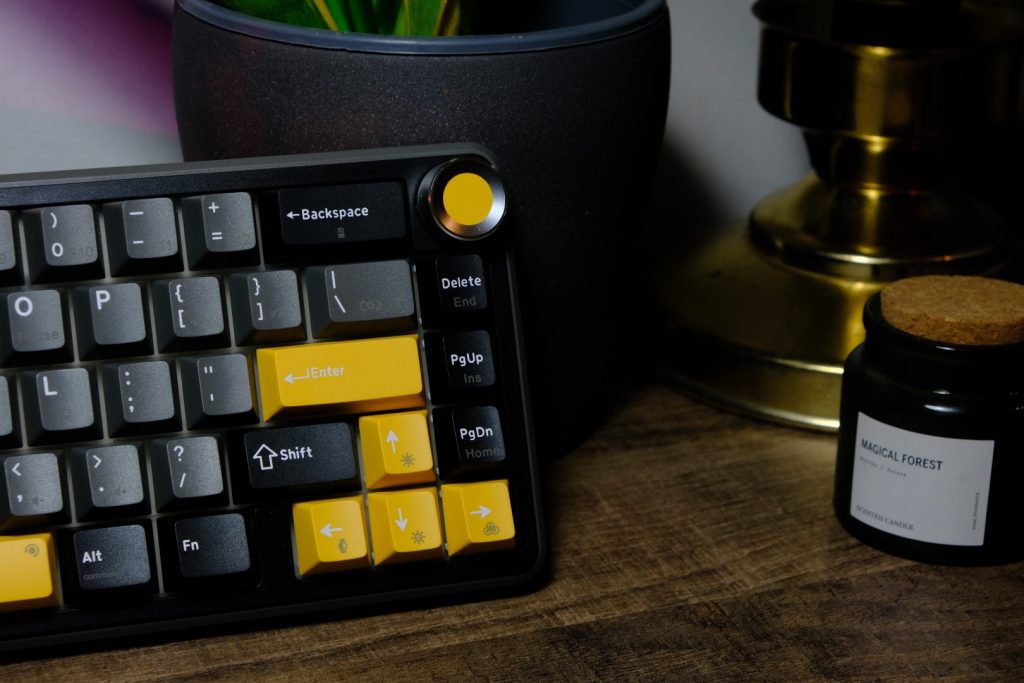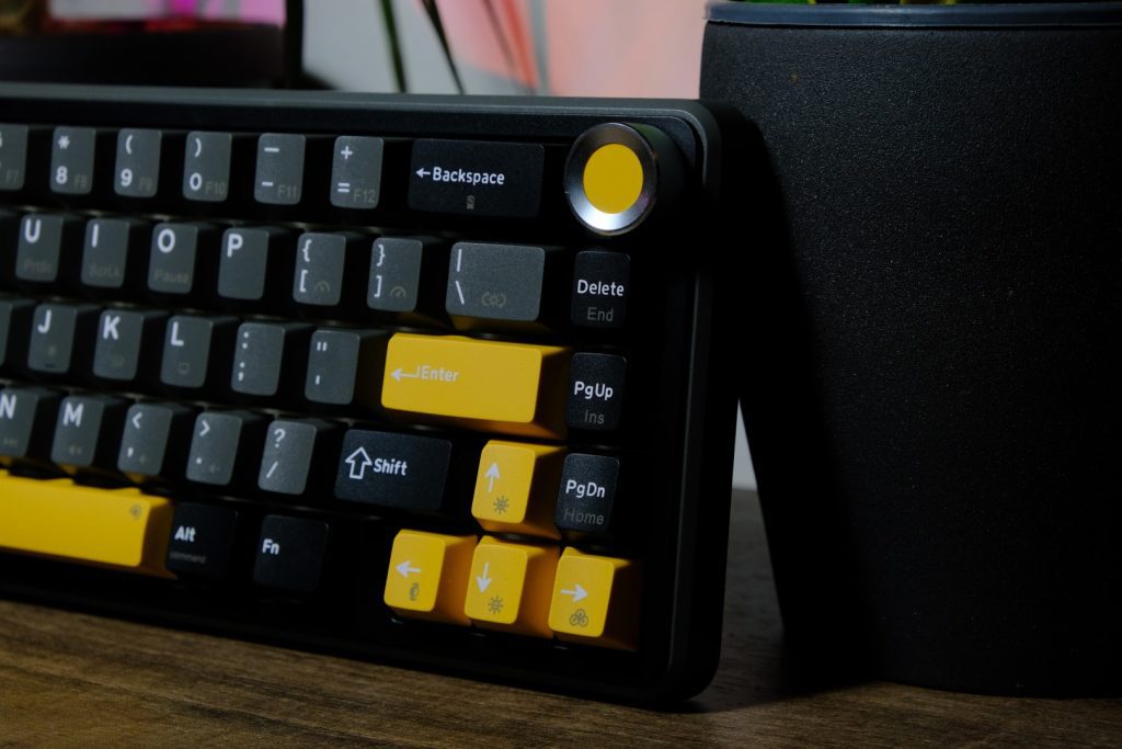 Un element interesant este sistemul gasket mount, combinat cu o placă din policarbonat (PC plate), care contribuie la o experiență de tastare mai moale și mai controlată. E ca și cum ai avea amortizoare pentru degete, o tastatură perfectă pentru cei care redactează texte și scriu foarte hotărât. Puncte bonus pentru prezența potențiometrului de volum, echipat cu buton metalic și care adaugă un plus de funcționalitate plus un accent vizual plăcut.