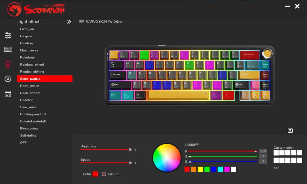 Continuând cu RGB-ul, pot derula efectele luminoase folosind combinații de taste, nefiind obligat să folosesc software-ul tastaturii. Dacă sunteți curioși, da, funcționează nativ și pe Linux, dar trebuie luat aminte că programul dedicat nu va rula sub acest sistem de operare (fără moduri sau alte trucuri software).
